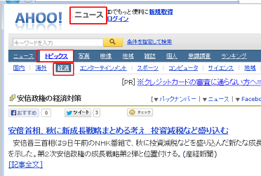 「ニュース」サイトの、「トピックス>経済」の記事のセクションにいることが一目でわかる。