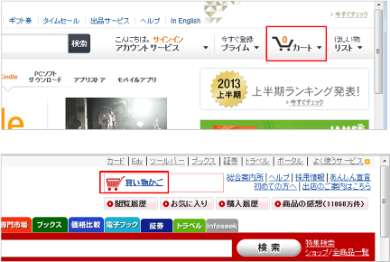両ショッピングサイトともに、画面右上のカートアイコンで、買い物かごを確認する機能をユーザに提示している。